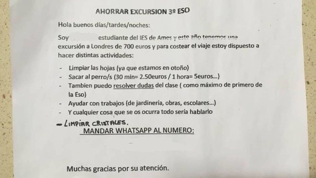 Un niño gallego de 14 años, que estudia tercero de la ESO en un instituto en Ames (A Coruña), publicó un anuncio que se ha hecho viral. En él se ofrece a los vecinos para realizar varias tareas y así poder conseguir el dinero que necesita para costear un viaje a Londres con sus compañeros.