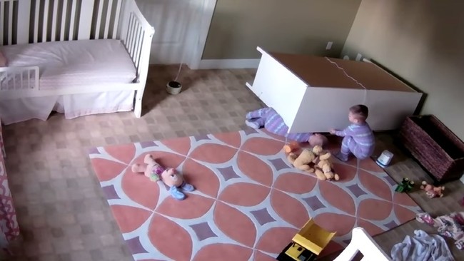 Las imágenes fueron tomadas por las cámaras de vigilancia de la habitación de los niños en un momento en el que a los pequeños se les ocurrió "escalar" el mueble. Al quedar dispuestos los cajones en forma de escalera, los niños trepan y, al no estar anclado a la pared, el peso hace que vuelque quedando uno de ellos atrapado debajo.