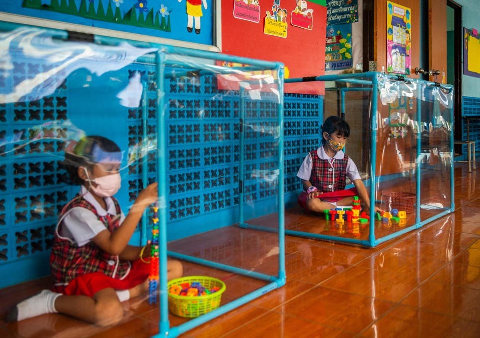 Una de las que le ha dado la vuelta al mundo es la extrema medida de seguridad y prevención que se ha tomado en Tailandia, al colocar enormes urnas y mamparas de plástico para evitar que los niños se acerquen y respeten el distanciamiento social.