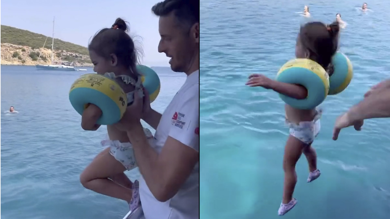 Se ha publicado un vídeo en Twitter de algo que debemos evitar a toda costa. En el vídeo se muestra a un adulto, desde un barco, lanzando al agua a una niña pequeña con dos manguitos.