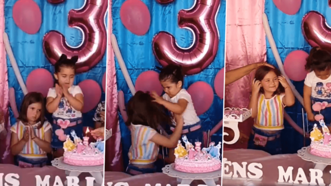 Tras hacer esto, la festejada voltea a ver a su hermana, quien parece burlarse de lo que acaba de hacer, por lo que la menor se molesta aún más y reacciona de forma violenta contra ella, tirándole del cabello.