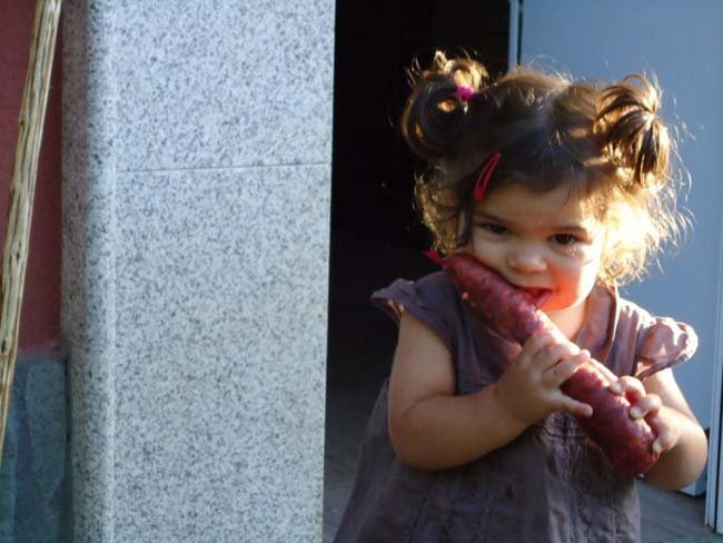 Resulta que a Alba le chifla el chorizo y al verlo encima de la mesa de la cocina de la casa de sus abuelos en el pueblo, no pudo resistir la tentación de cogerlo tal cual, enterito. Lo que no sabía es que era picante, pobrecita, aunque aún así resultó muy difícil que soltara tan sabroso manjar.