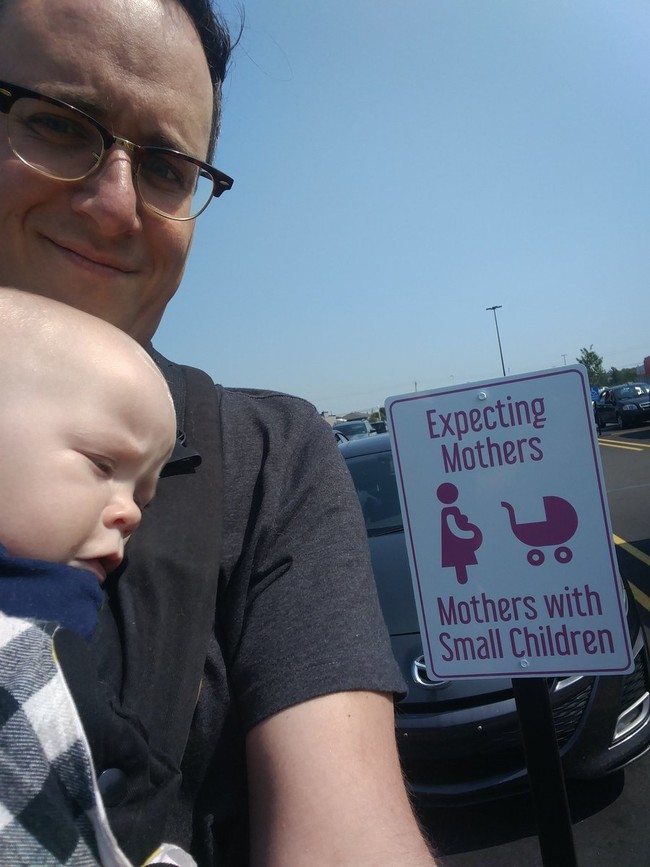 Cuando Justin Simard fue a comprar a un supermercado con su hijo de nueve meses, se encontró con una señal en el aparcamiento que indicaba que ciertas plazas estaban reservadas para mujeres embarazadas y madres de niños pequeños.