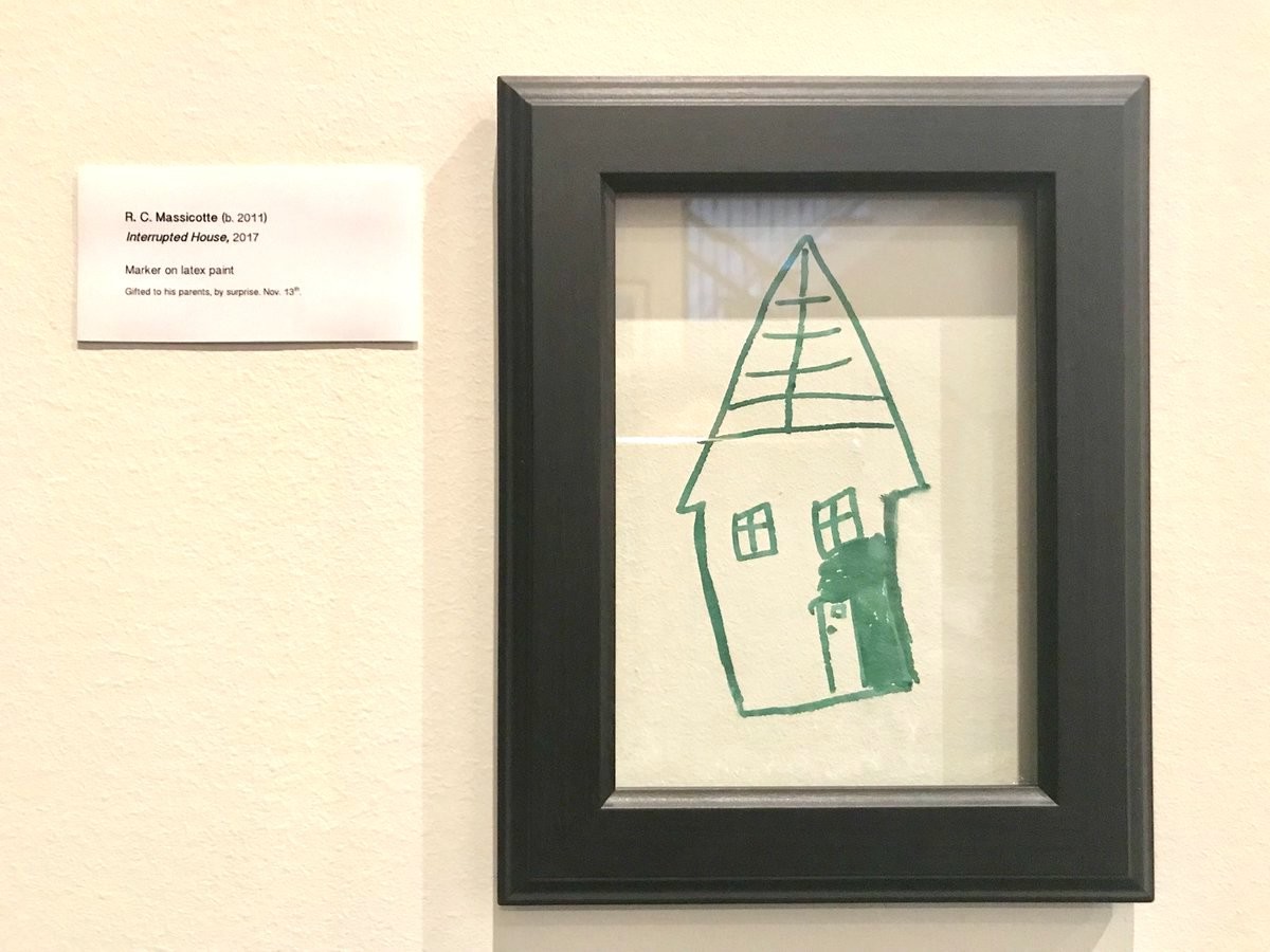 "Casa interrumpida , 2017. Marcador sobre pintura de látex. Regalado por sorpresa a sus padres. 13 de noviembre".