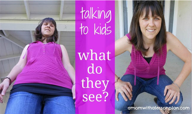 Desde A mom with a lesson plan, nos recomiendan ajustar nuestra postura cuando hablamos nuestros hijos, y ¿qué mejor manera de hacerlo?: la que vosotros queráis, siempre que exista un buen contacto visual y cercanía por parte del adulto.