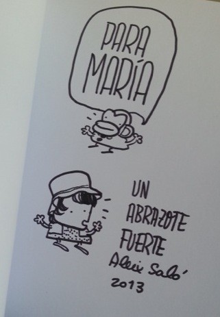 Y la experiencia superó expectativas. Aleix estuvo encantador, muy agradecido a María y creo que sorprendido de que tuviese una fan tan joven. Quizá la producción de sus vídeos no sean aptos para niños, aunque por supuesto que cada uno elija lo que considere oportuno para ver con sus hijos. Mi hija aprovechó para pedirle que le dibujara un monito de simiocracia y además Aleix se animó a realizarle una divertida caricatura aprovechando el gorrito que llevaba para protegerse del calor en la Feria del libro. La peque se ha leído gran parte del libro y especialmente le ha gustado y ha entendido la parte en la que se explica el origen de la Vieja Europa.