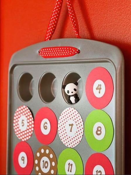 De esas que están hechas con silicona y sirven para hornear unas ricas magdalenas… Pues bien, la idea es escoger una que tenga suficientes orificios (24) y convertir cada huequecito en cajitas de sorpresas. Después recortáis a medida trozos circulares de cartulina de colores que hagan de tapa, y dibujáis sobre ellas los números (1 al 24, recordad el Adviento es la espera antes del nacimiento de Jesús), o podéis señalar con pegamento barra el contorno del numero y rellenarlo de purpurina, recortar números y pegarlos, etc. La idea la han encontrado en Cztery Katy.
