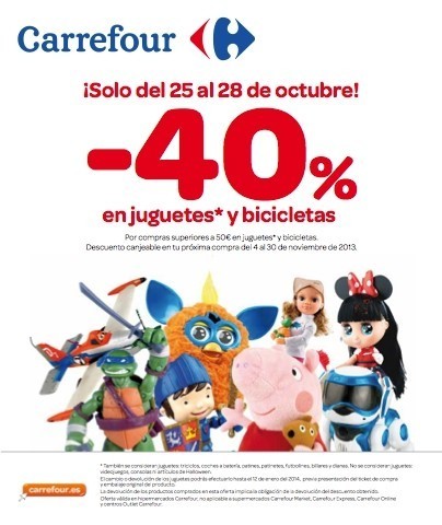Desde el viernes 25, hasta el próximo lunes 28 de Octubre podréis haceros con un descuento del 40% en la compra de juguetes y bicicletas en los hipermercados de esta cadena, por compras superiores a 50 euros. También, como viene siendo habitual el descuento se realiza en modo de "cheque ahorro" que podéis utilizar en vuestra próxima compra desde el 4 al 30 de Noviembre.