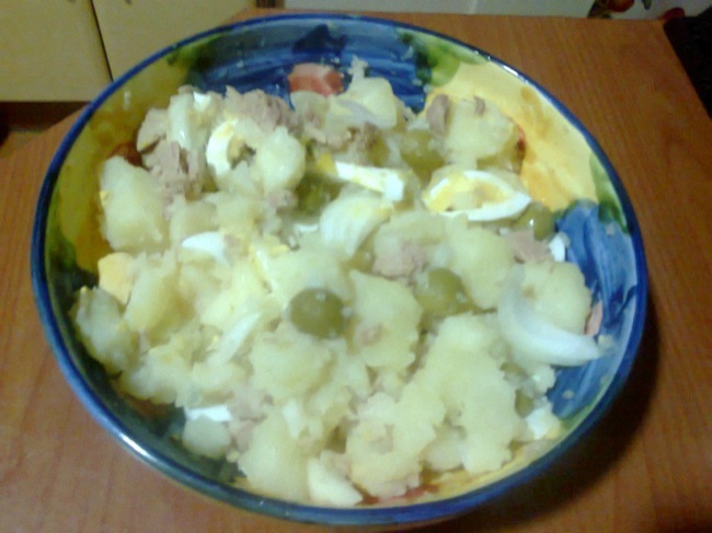 Se trata de una ensalada de patata por lo que evitamos los fritos y precocinados e incluimos los hidratos de carbono en su dieta que son necesarios y saludables. Los ingredientes son los siguientes: patatas de buena calidad para cocer, un huevo cocido, media cebolla (dulce preferiblemente), unas pocas de aceitunas y una lata de atún claro en aceite.