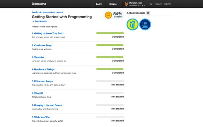En Peques y Más comentamos recientemente que en España es necesario promover en las escuelas el conocimiento de la programación de ordenadores. Aunque no es la solución definitiva si es un gran paso adelante el uso de la página Codecademy para aprender a programar. Codecademy es una combinación de enseñanza y tecnología que propone aprender de forma sencilla muchos conceptos para empezar a programar. En una época en la que los cursos de formación tienen un exceso de ofimática y una fuerte carencia de práctica, parece que hemos olvidado aquello de es mejor que no me des peces sino que me tienes que enseñar a pescar. Y es que aprender programación, en una forma inicial es mucho mejor que nada. Además Codecademy incluye un componente social de competición sana con medición del progreso y obtención de placas a modo de logros y retos superados. En la imagen están mis propios progresos con la aplicación y creo que para niños a partir de los 10-12 años puede ser una buena forma de acercarse a esta disciplina.