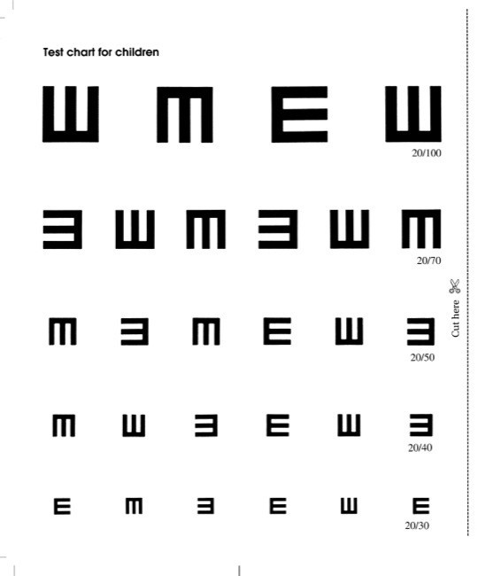 Mientras tanto podéis probar en casa con este cartel y comprobar si el peque identifica correctamente hacia donde apuntan las púas o, jugando con las letras: w, m, e a la izquierda y e a la derecha. En casa mi hija lo vio y como me parece que le hacen evaluaciones en el colegio, empezó a mover la mano marcando el sentido de las púas. Así que por ahora parece que la vista progresa adecuadamente.