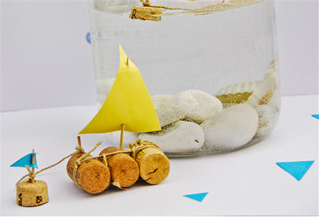 Una vez acabada la embarcación, llenamos un tarro grande de cristal con agua e introducimos piedras, conchas, arena de la playa… en el fondo. El barco flotará, y aunque no tenga espacio para navegar, quedará una preciosa manualidad para adornar la habitación de los niños, o para que ellos regalen a sus amigos.