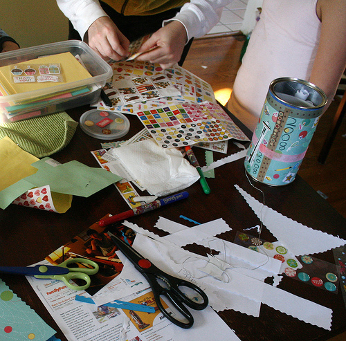 La caja, bote o tarro se decorará con papel decorado y gomets, y dentro se introducirá el papel, previamente recortado si lo creen necesario. Por último se tapa y se precinta para guardarlo.