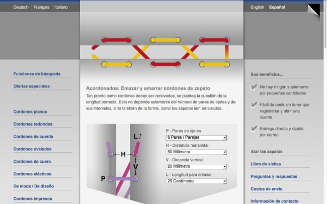 Se llama la tienda de cordones y es un sitio para encontrar y adquirir cordones de marcas en todas las formas y colores imaginables. Además el diseño de la página está muy bien tratado y los productos se presentan como si fueran alimentos porque están la mar de apetecibles y se pueden disfrutar con su textura, forma y color.