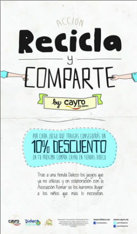 Allí se encargarán de almacenarlos y enviarlos a la ONG Remar Internacional, con sede en Madrid. Una asociación sin ánimo de lucro que tiene como objeto mejorar la calidad de vida de niños y familias sin recursos. Por cada juego donado, se obtendrá un bono del 10% de descuento para canjear en el próximo juego educativo Cayro que se adquiera en tiendas Dideco.