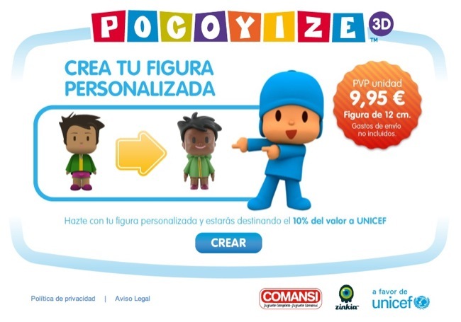 Pocoyó es un personaje infantil fantástico y a los niños más pequeños les encanta. Llevan muchos años triunfando con el Pocoyizador, una máquina que te permite generar tu propia caricatura con el estilo de este simpático personaje. Más de 15 millones de personas en todo el mundo se han pocoyizado y han creado su imagen. El reto de llegar al mundo real se ha superado y ya es posible obtener una figura real de 12 centímetros de la mano de Comansi y Zinkia. Son figuritas personalizadas que además son solidarias ya que Comansi donará el 10% de la compra de cada figura a UNICEF para luchar contra la desnutrición infantil.