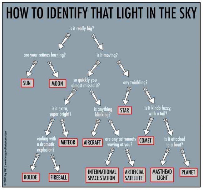 En la guía se puede saber si la luz se mueve, si es intermitente, si vivimos cerca de una ciudad, qué si mueve muy rápido es porque es un avión y desde luego si se está lejos de la contaminación lumínica seguro que puede ser una estrella, sobre todo si titilan, o un planeta como Marte o Venus, del que hay que saber ¡el lucero del alba! que es el que siempre aparece cerca del horizonte justo antes del amanecer o después del atardecer. Y desde luego sentido del humor no le falta porque ¿en serio que no sabes identificar todavía el sol o la luna? o ¿la luz del mástil de un barco? o ¿has visto saludar a los astronautas de las ISS?