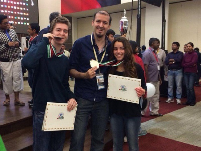 El año 2013 terminó con una gran noticia deportiva para el ajedrez español porque se acaba de celebrar el campeonato del mundo sub-8 a sub-18 en la ciudad de Al Ain en los Emiratos Árabes Unidos y además de que cuatro jugadores españoles han finalizado entre los diez primeros del ranking, David Antón con 8 puntos e Irene Nicolás con 8,5 han ganado el subcampeonato del mundo en sus respectivas categorías. En la imagen se puede ver a ambos jugadores, maestros internacionales, con sus medallas de plata junto a su entrenador David Martínez Martín, maestro internacional desde el año 2006 y que trabaja en Ajedrez con cabeza. David entrena a David Antón y a Irene Nicolás.