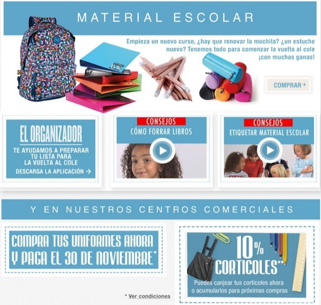 Además El Corte Inglés permite financiar la compra de los uniformes retrasando el pago hasta el 30 de noviembre por compras superiores a 200 euros y con unos gastos de gestión de 9 euros. Aunque conviene revisar y consultar las condiciones porque también está sujeto a la aprobación de la Financiera El Corte Inglés.