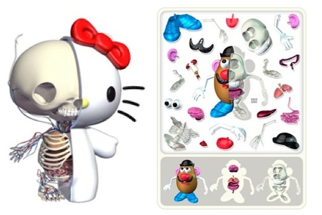 Da un poco de repelús, pero se me ha ocurrido que sería ideal para que los niños aprendieran cuestiones básicas de anatomía. Una especie de juego "Operación" pero con los personajes infantiles más populares. Una curiosidad que hará que la próxima vez miremos a Hello Kitty de otra forma, imaginando el interior de los juguetes de los niños con algo de realismo.