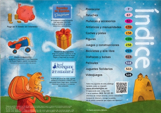 Desde el enlace de más abajo se puede acceder al catálogo interactivo de juguetes (aplicación en flash) que también es sorprendente y está lleno de atractivos para los niños en sus más de 350 páginas. Hay una clasificación por categorías: preescolar, peluches, muñecas, juegos artísticos, coches, construcciones, bicicletas, disfraces, películas y una completísima sección de videojuegos y videoconsolas en la que están representadas las más exitosas en el mercado. Además hay una amplia sección de juguete solidario con la que El Corte Inglés quiere hacer una donación del 20% del precio a UNICEF para contribuir a sus proyectos humanitarios.