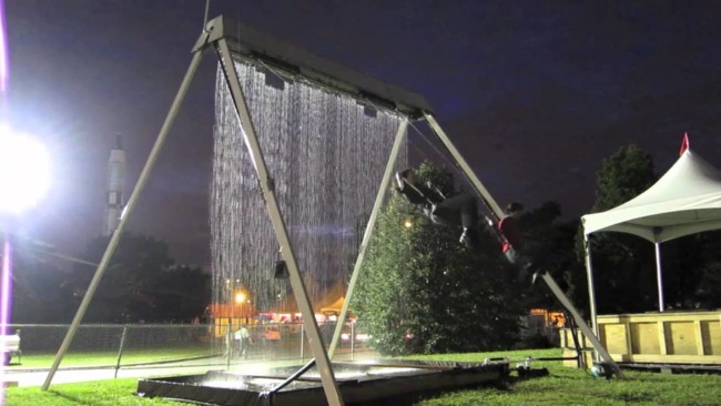 El mecanismo es sencillo, el agua circula a través de la parte superior de la estructura del columpio y cae creando una pared de agua perfecta. El agua se recoge del suelo y se bombea hasta la parte superior del columpio permitiendo que no haya pérdida. Unos sensores montados en el asiento del columpio permiten reunir la información sobre el ángulo y la velocidad de cada oscilación. Esa información se envía a un equipo que ajusta la salida de agua asegurando, si te fías, que el que monta el columpio no se moja mientras se balancea. Es muy sencillo y el efecto resulta espectacular. Habría que ver este columpio en funcionamiento con esos chiquillos que son capaces de balancearse a toda velocidad.