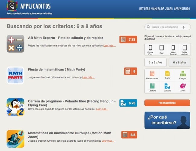 Para los hijos con edades entre los 3 y los 8 años, Applicaditos puede servir de apoyo a la educación de tus hijos. En las aplicaciones se valoran y puntúan los gráficos, la validez educativa, la usabilidad y la adaptación a la edad y al final se obtiene una puntuación media. Las aplicaciones están categorizadas por temas y se pueden encontrar contenidos de matemáticas, grafo, lengua, lectura, juegos y artes. Todas las aplicaciones las valoran expertos y además ofrecen a los desarrolladores su página para que se analicen sus productos.