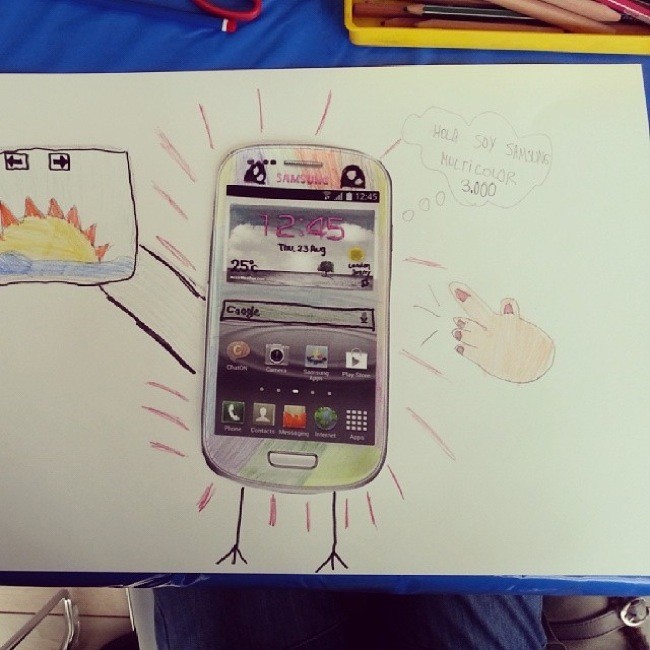 En el vídeo se puede ver a mi hija explicando las funcionalidades que desarrollamos para un teléfono móvil al que llamó Samsung 3.000. Se trataba de construir un aparato que respondiera a las emociones y que cambiase de color en función de nuestro estado de ánimo para inspirarnos y alegrarnos. Además se podía apagar con un chasquido de dedos y, la funcionalidad que aporté y que mi hija mejoró y amplió, que pudiera proyectar imágenes como por ejemplo la agenda de contactos, vídeos de YouTube, fotos de Flickr y mensajes de Gmail.