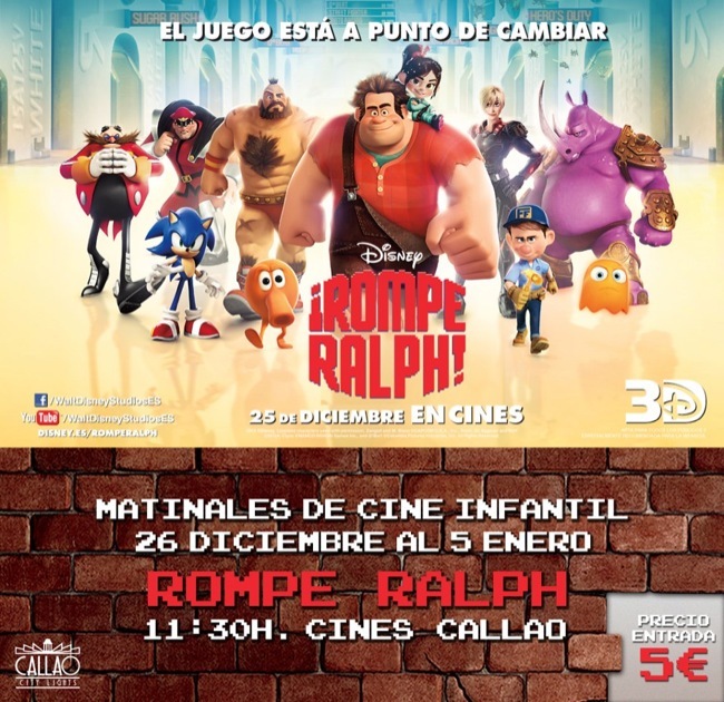 Desde Callao City Lights han creado un atractivo regalo para toda la familia en forma de película. Desde hoy y hasta el 5 de enero de 2013 se puede acudir a los Cines Callao para ver ¡Rompe Ralph! la película Disney que es una de las atracciones principales para estas Navidades.