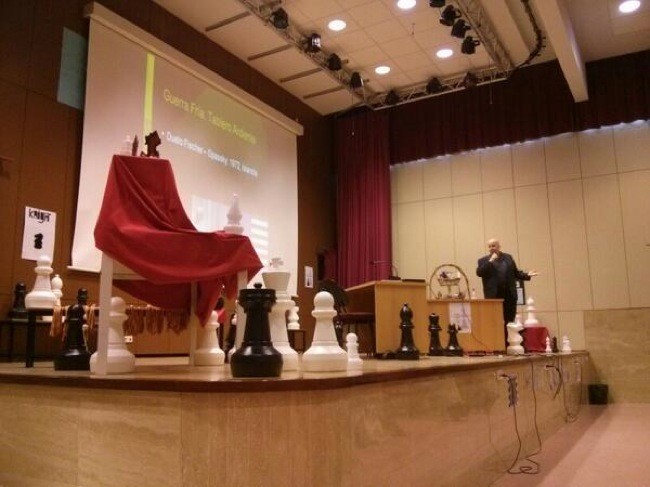 Leontxo nos explicó que lo que más le divierte es dar conferencias y conseguir ganarse la atención del público. Con la charla que preparó, esta vez titulada un Viaje por el fascinante mundo del ajedrez, nos pasamos más de una hora de entretenimiento conociendo los orígenes del ajedrez, establecido en Persia en el Siglo V, el impacto de España con Alfonso X el Sabio en el siglo XIII y con Ruy López de Segura en el siglo XVI. Y es que se considera que es en esa época cuando se incorpora la Dama, o Reina, en el ajedrez moderno y que además su incorporación es un homenaje a la Reina Isabel La Católica. También Leontxo mencionó que la FIDE, la federación internacional de ajedrez, tiene jugadores federados en más de 180 países lo que convierte a este deporte en universal, sólo superado por el fútbol, y que además permite jugar al ajedrez prácticamente en cualquier parte del mundo.