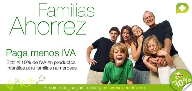 Familias ahorrez es la primera campaña que ofrece a las familias numerosas la oportunidad de comprar productos infantiles con un descuento de un 11% correspondiente al I.V.A. inferior hasta el próximo 15 de junio. Así, los artículos a los que actualmente se les aplica un impuesto del 21%, pasarían a tener un 10%, como los pañales. Para obtener más información, las condiciones de la campaña y especialmente las restricciones que puedan existir, recomiendo acceder a su página en Internet.