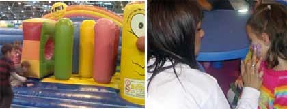 Para los bebés mayorcitos o para los hermanos de los bebés pequeños hay diversos entretenimientos como un castillo hinchable, pintura facial, talleres de pintura, cuenta cuentos y para los más competitivos una pista de gateo para participar de carreras patrocinada por Difrax, una marca de productos holandesa que me ha encantado de la que les hablaré luego, que junto a dos matronas ofrece sesiones de estiramientos musculares para que los papás realicen a sus bebés.