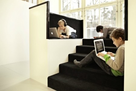 Las fotos que ilustran el post son de la escuela Vittra de Telefonplan (en Estocolomo) y los espacios han sido diseñados por el estudio de Rosan Bosch: árboles inertes que sirven de inspiración para pensar, un iceberg central que alberga la pantalla de proyecciones, la sala de ejercicios, las casetas para que los niños se reúnan espontáneamente.