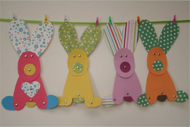 Seguimos con la nariz, la cola y los pies. Repitiendo el proceso obtendremos tantos conejitos como deseemos. Por último los podemos colgar del cordón con pinzas y ya tenemos una divertida guirnalda de Pascua.