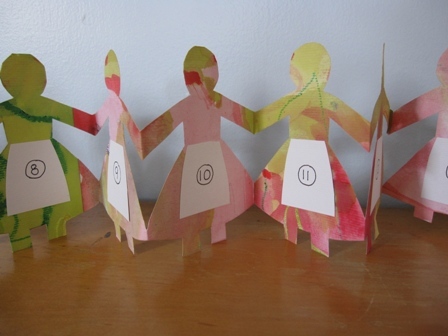Jean y su hija han pintado una de papel absorbente con trazos de acuarela y después la han cortado por la mitad doblando los bordes. El patrón de una muñequita, las dobleces para que se cojan de las manos y unas tijeras resistentes hacen el resto. Tras unir de nuevo las dos tiras han preparado unos delantales de papel con los números de los días escritos en el frontal, al pegarlos a las muñecas se deja un hueco para introducir un papel enrollado con la sorpresa para los peques.