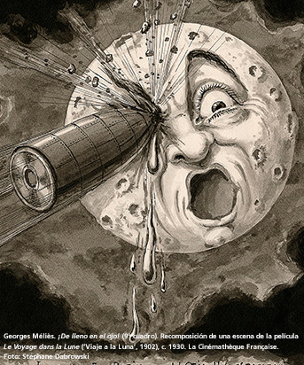 Así que hay que felicitar a la Obra Social ”la Caixa” que siguiendo con su tradición de programar exposiciones de temática cinematográfica, presenta un homenaje a quien ha sido llamado el primer mago del cine, Georges Méliès. La muestra repasa la diversidad de su obra y el valor que ha tenido en la evolución de la historia del cine. La película de Méliès está llena de descaro e imaginación con una alocada luna que recibe el impacto de un proyectil tripulado que llega desde la Tierra.