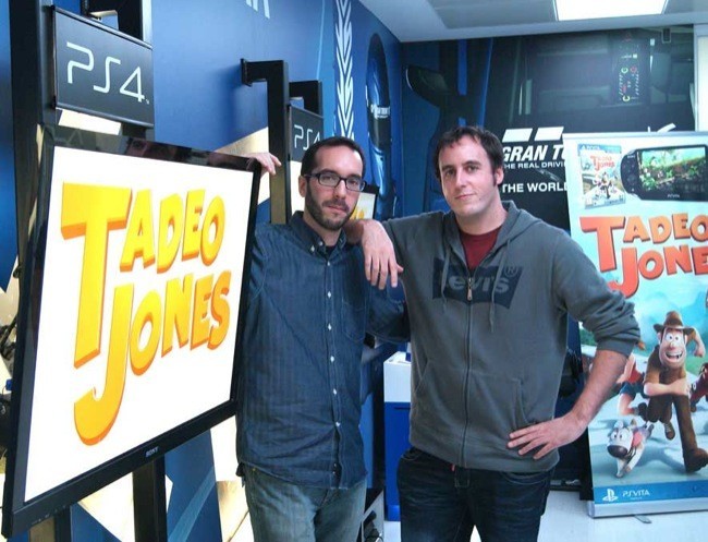 En la imagen se puede ver a Jordi Torras, productor del videojuego de Tadeo y director de U-PLAY Studios, y a Enrique Gato (con barba), director de la película de animación Tadeo Jones que ha sido la más taquillera en la historia del cine español en 2012, que recientemente han presentado en Madrid el juego para la PS Vita que permite vivir en la consola grandes aventuras del famoso aspirante a explorador. El videojuego está preparado para peques de 6 a 12 años y tiene PEGI 12.