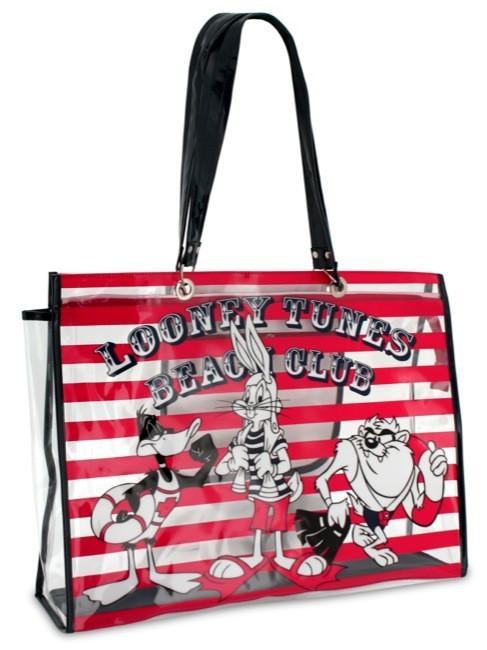 La colección presenta bolsos grandes, cómodos y prácticos, de material impermeable y con diseños de tendencia print navy, con motivos marineros, y diseños de grandes lunares en tonos rojo, azul y negro. Los protagonistas de los divertidos diseños son los conocidos personajes de los Looney Tunes Busgs Bunny, Silvestre, Taz o Pato Lucas que aparecen en carteras portatodo de dos tamaños, grande y pequeño, para llevar sólo lo imprescindible a la playa como la crema de sol, las gafas o el móvil.