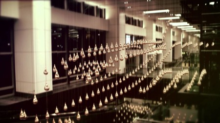 En el vídeo que ilustra el artículo, y que hemos visto en Microsiervos, se puede ver una fascinante escultura que se ha instalado en ese aeropuerto. Se trata de Kinetic Rain y aprovecha todas las tecnologías robóticas actuales para conseguir unos efectos preciosos y que en directo tienen que resultar espectaculares. La escultura está compuesta por 1.216 gotas fabricadas en bronce que cuelgan de unos finos hilos y que con los motores incluidos en el soporte, hacen que las gotas suban y bajen. El efecto es mucho más espectacular cuando el software utilizado se pone en marcha haciendo que los motores, de forma coordinada, faciliten que las gotas jueguen en el espacio creando un resultado hipnótico.