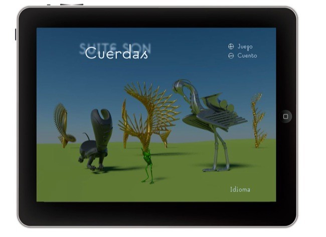 La empresa española L3C Multimedia presenta la aplicación gratuita Cuerdas. Se trata de una parte del proyecto Suite Son que son una colección de cuentos interactivos para iPad basados en la obra de la artista Teresa Tomás. La colección se inicia con las aventuras del perro Cuerdas, y en próximas entregas se podrán ver las del pájaro Viento y las de la rana Percusión. Todos los personajes se anticipan en la imagen que se incluye en la aplicación y tienen un diseño, en mi opinión, algo sofisticado para los niños.