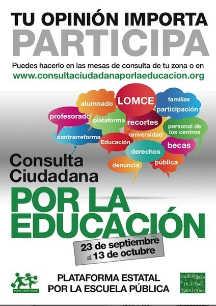 Ha sido convocada por la Plataforma Estatal por la Educación Pública, y se pretende conocer la opinión de los españoles sobre los recortes y políticas educativas del Gobierno (como la LOMCE y el RD de Becas). La iniciativa incluye la instalación de mesas en las inmediaciones de centros educativos, escuelas infantiles, colegios, institutos y facultades universitarias de todo el país, además de en algunos puntos neurálgicos de las principales ciudades.