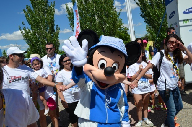 Como el año pasado, uno de los mayores atractivos de este encuentro, especialmente para los más pequeños, ha sido la asistencia de Mickey, Minnie, Donald y Goofy con los que se han hecho fotografías durante gran parte de la tarde. Estos conocidos personajes han sido los encargados de dar la bienvenida a todos los participantes, saludando y fotografiándose con sus seguidores. Además, hemos podido participar en una sesión de calentamiento liderada por Mickey y Minnie y que después, como muestra la imagen, Mickey se dirigió a la línea de salida para inaugurar la camina familiar.