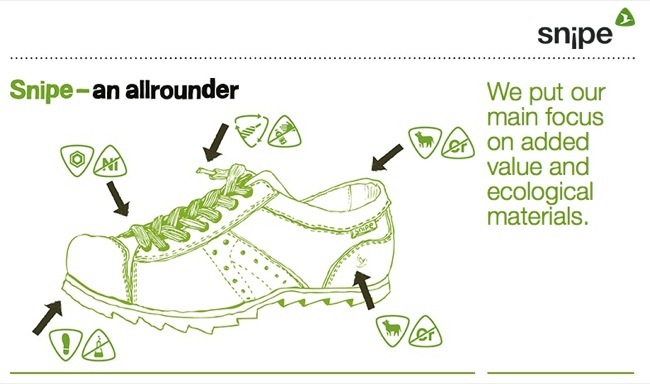 Además Snipe realiza la curtición de la piel sin utilizar cromo lo que asegura que los zapatos están libres de este tipo de material tóxico. El proceso de fabricación se realiza con la curtición en titanio que es un metal sin efectos tóxicos y que se degrada rápidamente. Para las suelas se emplean materiales termoplásticos biodegradables.
