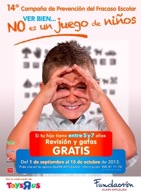 El 90% de la información que recibe el alumno es a través de la vista y la 14ª Campaña de Prevención del Fracaso Escolar permite que ópticos-optometristas titulados de sus más de 260 ópticas revisen gratuitamente la vista a niños de entre 5 y 7 años y regalen gafas a todos los que lo necesiten. La campaña estará activa hasta el 15 de octubre de 2013, y se hará siguiendo un protocolo clínico avalado por las facultades más prestigiosas en Optometría.