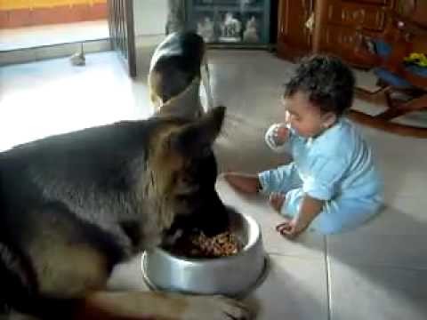 O titulado de otra manera, "qué sucede si juntas a un bebé y a un perro con su comida". Cuando una pareja tiene animales y va a tener un bebé siempre se pregunta por la seguridad de su futuro bebé y por cómo aceptará el animal, en este caso el perro, la llegada de una nueva y pequeña criatura. La realidad suele ser que el perro hace lo que buenamente puede para no hacer daño al bebé y que pronto, cuando el niño crece, hace lo que buenamente puede para sobrevivir él mismo. Esto es lo que sucede en este vídeo en el que el perro, que tiene más paciencia que un santo, intenta comer mientras un niño pequeño le retira la comida una y otra vez. Da la impresión de que el animal, en cualquier momento, se quejará y dirá "¡Guau!" (¡Basta!). Sin embargo no parece llegar a quejarse demasiado y todo queda en anécdota.