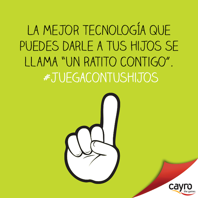 “Padres, tenemos un problema. Cada vez jugamos menos con nuestros hijos. Y cuando lo hacemos, estamos más pendientes del móvil que del juego. Y así no se juega”. Así comienza el ‘meñifiesto’ de Cayro de Games, en una campaña de concienciación llamada #JuegaConTusHijos.
