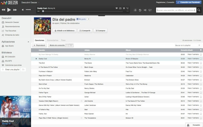 Me ha parecido muy original la propuesta de Deezer para regalar a los padres en el día de su celebración. Se trata de una lista de canciones o playlist, recopilada por el equipo editorial de Deezer y que se puede escuchar en esta plataforma de música a través de Internet. Además la lista de música es colaborativa, por lo que se pueden añadir más canciones y, más importante, compartir con más personas para completarla y hacerla más atractiva. En esta lista en concreto hay canciones de artistas muy variados, de estilos diferentes y de cualquier época. Todas tienen en común que se mencionan la figura del padre, así que ese puede ser un motivo más para añadir canciones y hacerla muy atractiva. Teniendo en cuenta las edades de los padres lectores me atrevo a decir que la mayoría incluiríamos éxitos de los años 80 y 90, más o menos la edad en la fuimos adolescentes y más.