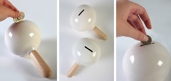 El diseño que proponen Jordi Gisbert y Verónica Coloma, creadores del estudio Ham & Cheese, es una hucha que cumple la función de ser además maraca. Los dos jóvenes llevan trabajando en el diseño desde el año 2009. Su propuesta de ahorro es divertida para los niños porque conforme se mete dinerito la maraca va produciendo un sonido diferente lo que asegura diversión a los niños. En todo caso me parece que son frágiles para jugar con ellas y lo que proponen es ser un objeto de diseño de lo más elegante.