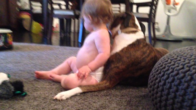 Son muchas las personas que dudan de la conveniencia de que perros y bebés vivan juntos, y aunque yo no tengo ni he tenido nunca perro, viendo imágenes como estas no puedo pensar en que pueda haber algo negativo en su relación. De hecho, mi mujer lleva un tiempo tratando de convencerme y cuando veo vídeos así me dan ganas de salir corriendo a hacerme con uno. Luego pienso en lo pequeño que es nuestro piso y el trabajo que ya de por sí dan tres niños y me resisto a meter a una cuarta criaturita dependiente en casa. Y en eso andamos, en las dudas.