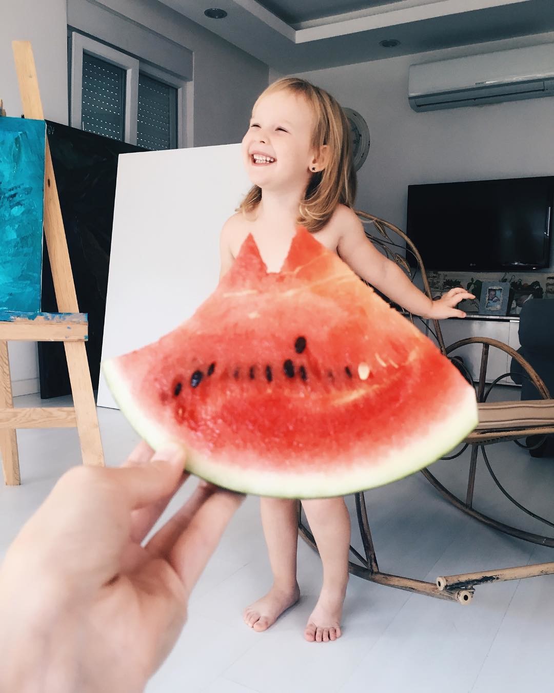Gracias al poder de la perspectiva, la madre sostiene a distancia piezas de frutas, verduras y flores, causando la ilusión óptica de que la niña lleva vestidos poco convencionales de sandía, plátanos, uvas o margaritas.